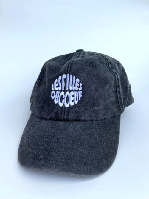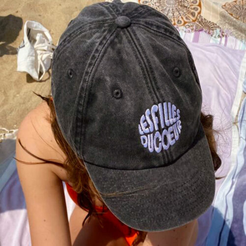 HOT PEOPLE KNIT – pinke bestickte Baumwollcap mit größenverstellbarem Verschluss und ca. 5 cm breitem Stick auf der Vorderseite und „LESFILLESDUCOEUR“ Schriftzug auf der Rückseite. Der verstellbare Verschluss ist im Vintage-Stil, wie auf den Bildern zu sehen in Messing-Optik angebracht.