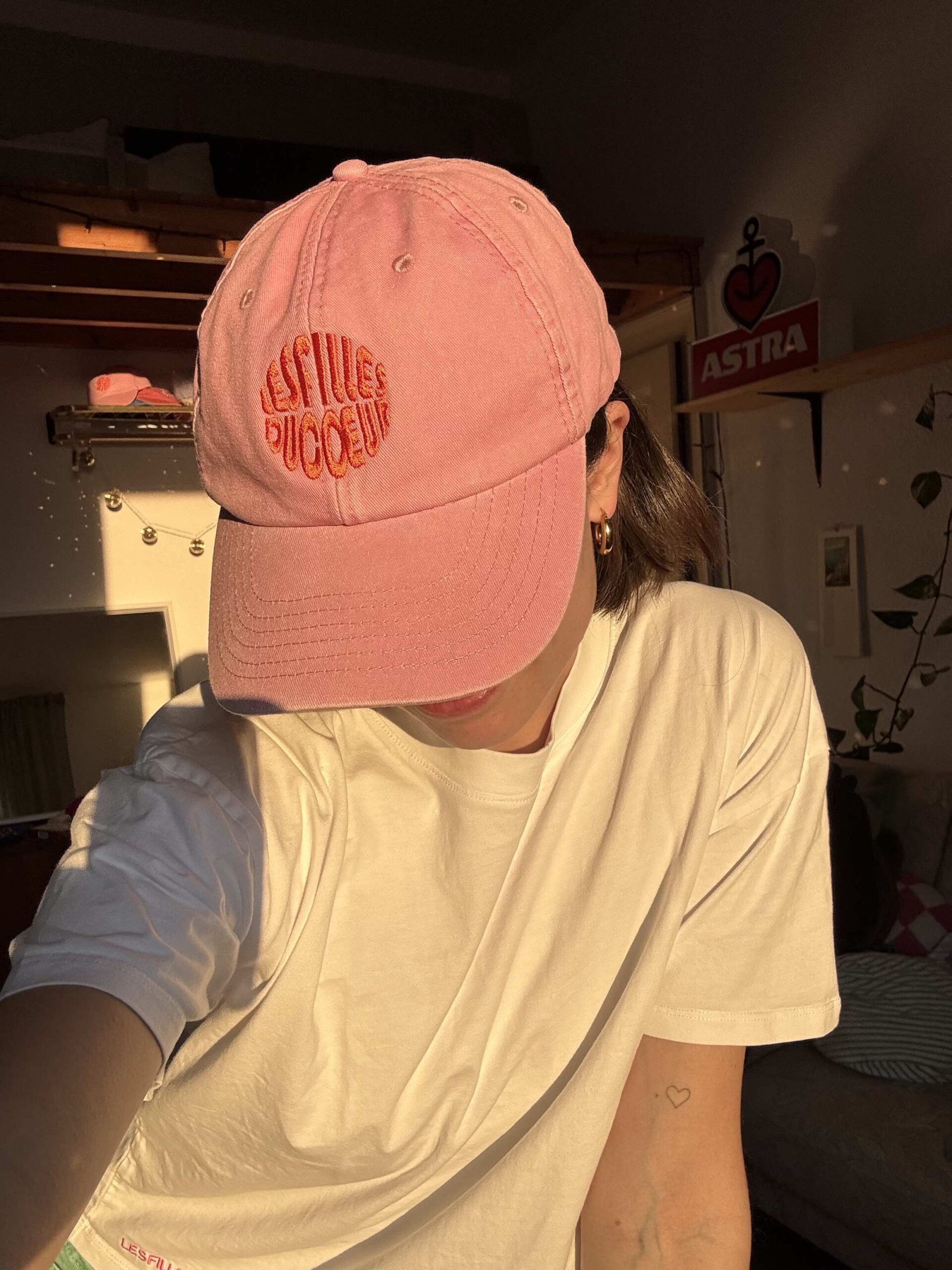 Bestickte Baumwollcap in rosa mit Stick in orange und größenverstellbarem Verschluss
