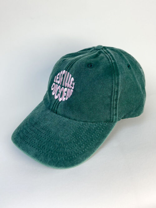 Our embroidered cotton caps with size-adjustable fasteners feature our logo in high-quality embroidery in the center front. The adjustable clasp is vintage-style, with a brass look as shown in the pictures.