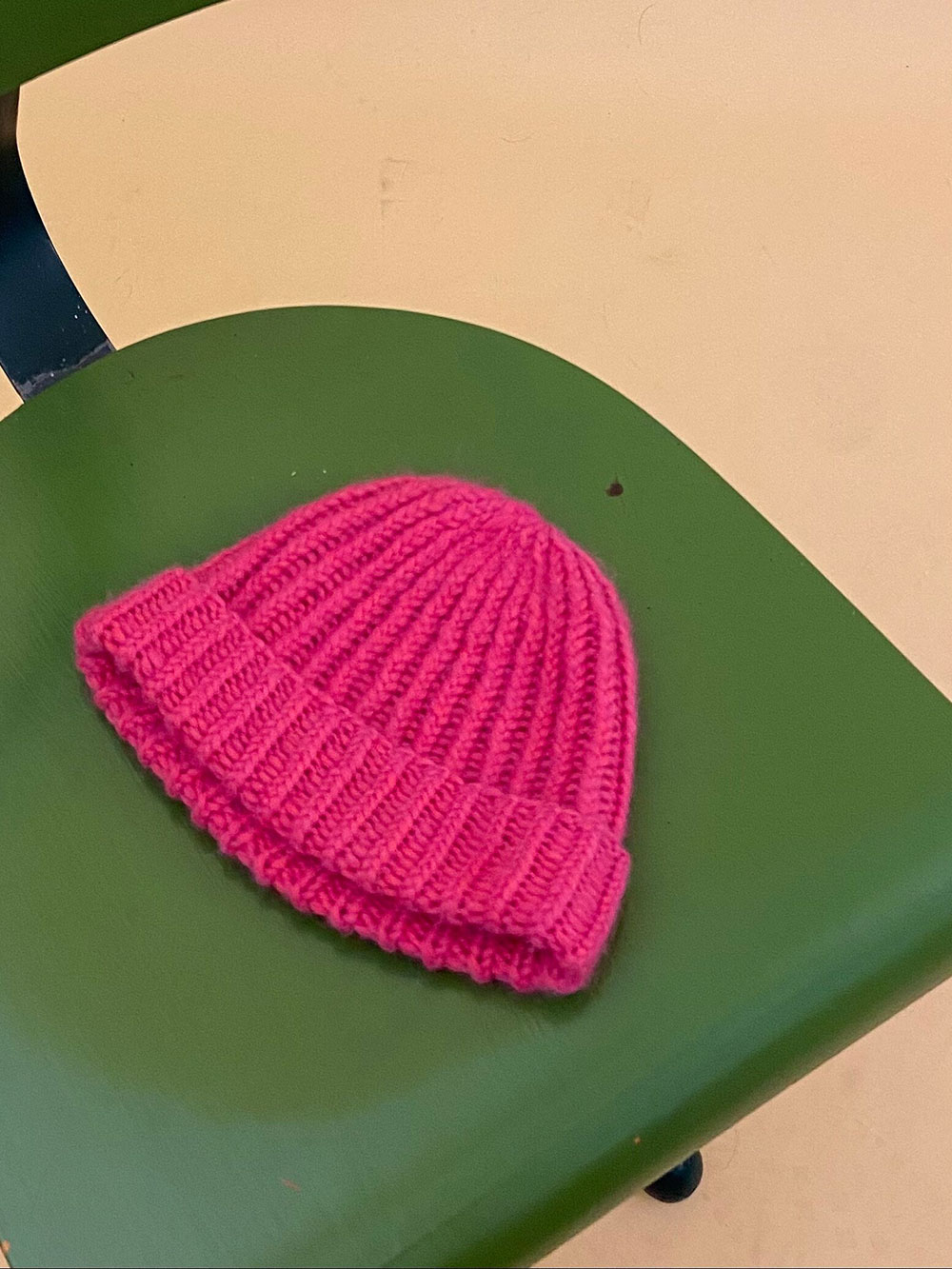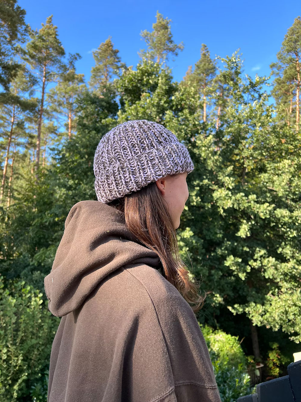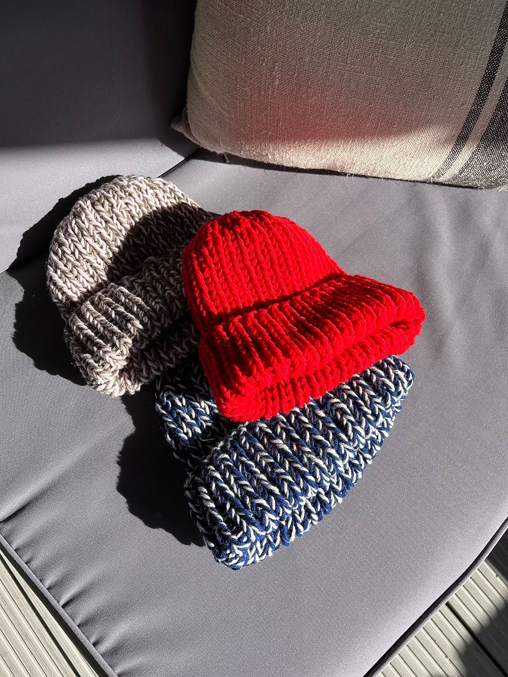 The MATS knitted hat made from merino wool is a cozy classic: ONESIZE and UNISEX It has a turn-up and IS knitted from the bottom up. The instructions are beginner-friendly. // Language: ENGLISH // Techniques used: – knit and purl stitches – decreases // LEVEL OF DIFFICULTY: LEVEL 1/5 beginner // SIZE: ONE SIZE // Fabric: 100 g Cool Wool Big by Lana Grossa (50 g = 120 m), DOUBLE THREAD // Needles: 7 mm circular needles (40 cm) // Stitch gauge: 18 W x 17 W = 10 x 10 cm (1 purl, 1 knit) If necessary, choose a different needle size to adjust the stitch gauge. *These instructions are for private use only. It may not be edited or resold. Pieces knitted according to these instructions may not be sold.