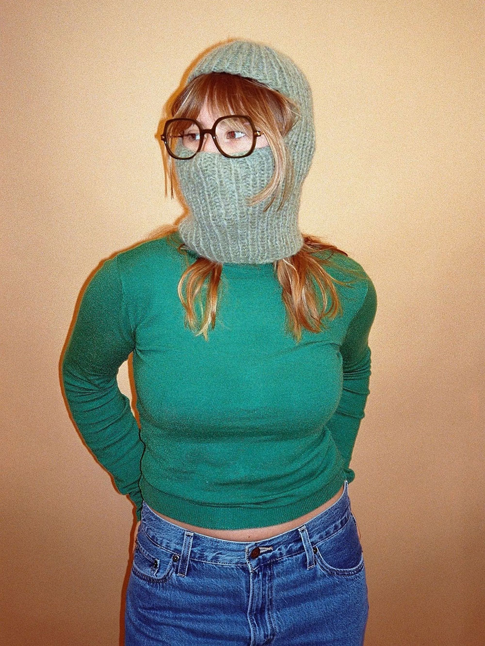 It has a slit for the eyes, which can also be flexibly pulled down under the chin. It is knitted from the bottom up.