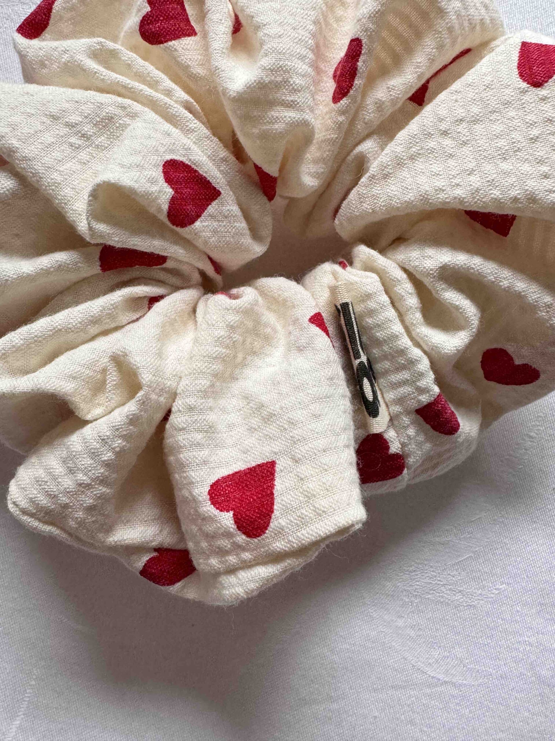 Handgenähtes Scrunchie aus creme farbenem Baumwollstoff mit roten Herzen und Logo-Label. Die außergewöhnliche Größe ist anhand der Fotos erkennbar. In jedem Haargummi steckt viel Sorgfalt und Liebe – es kann durch die Handarbeit zu minimalen Abweichungen in der Größe kommen