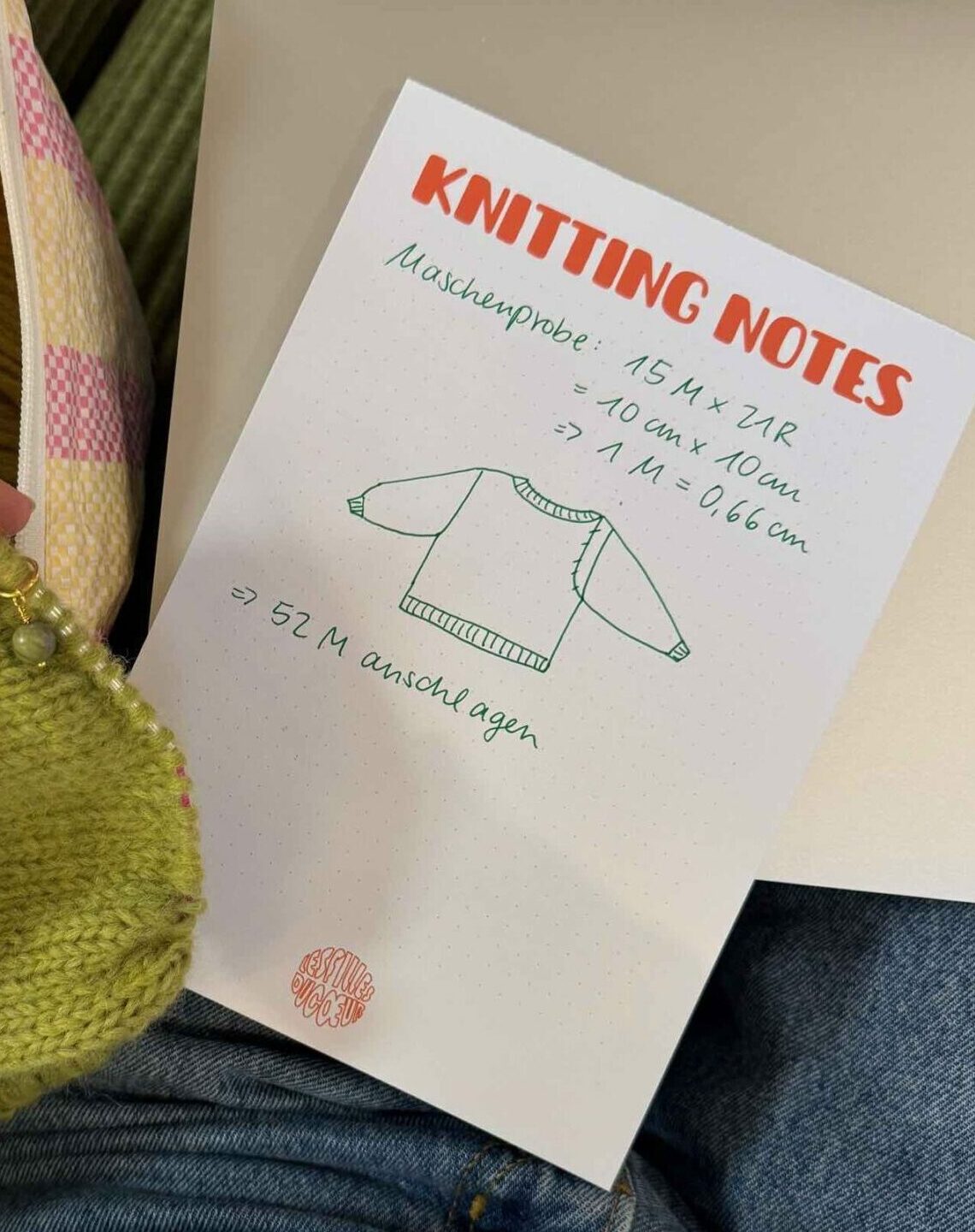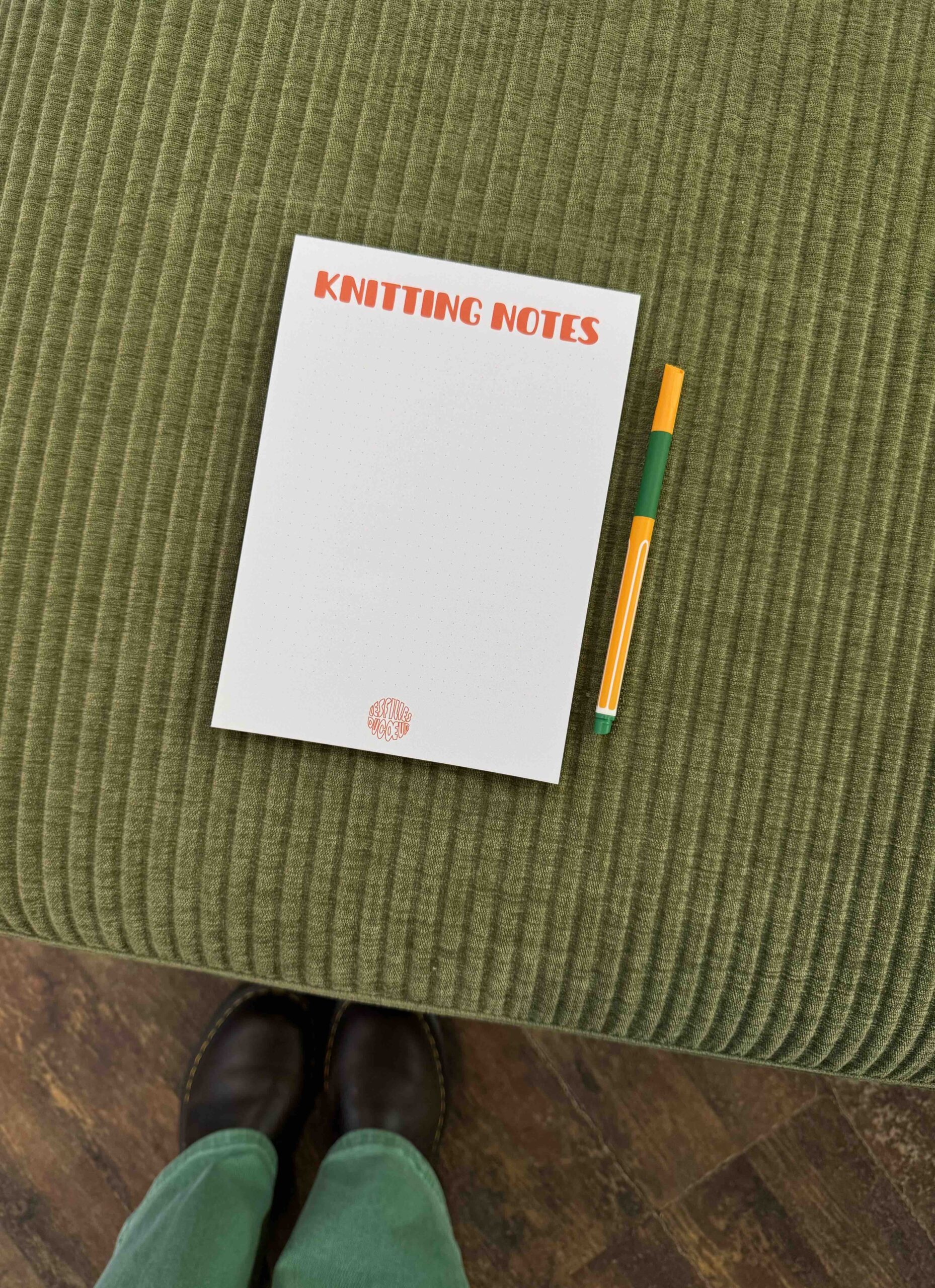 Notizblock für Strickfans mit rotem Schriftzug „knitting notes“ und Logo.
