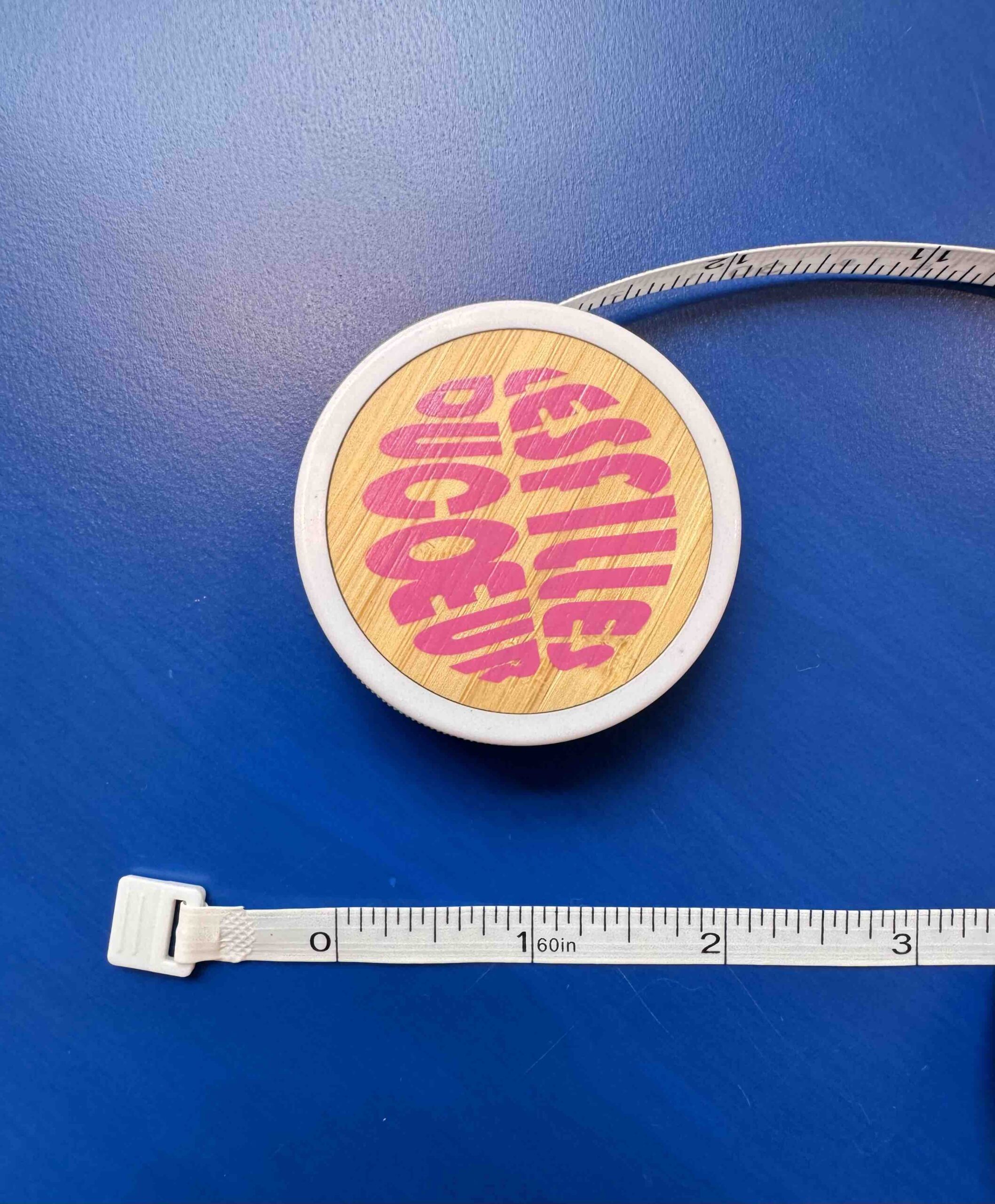 1,5m/60inch Schneidermaßband aus RCS recyceltem Kunststoff und Bambus mit Einzugsdruckknopf. Das Band ist 8 mm breit und per Knopfdruck einziehbar. Format: 5.2 cm x 1.6 cm x Ø 5.2 cm – passt perfekt in jeden Projektbeutel oder Mäppchen